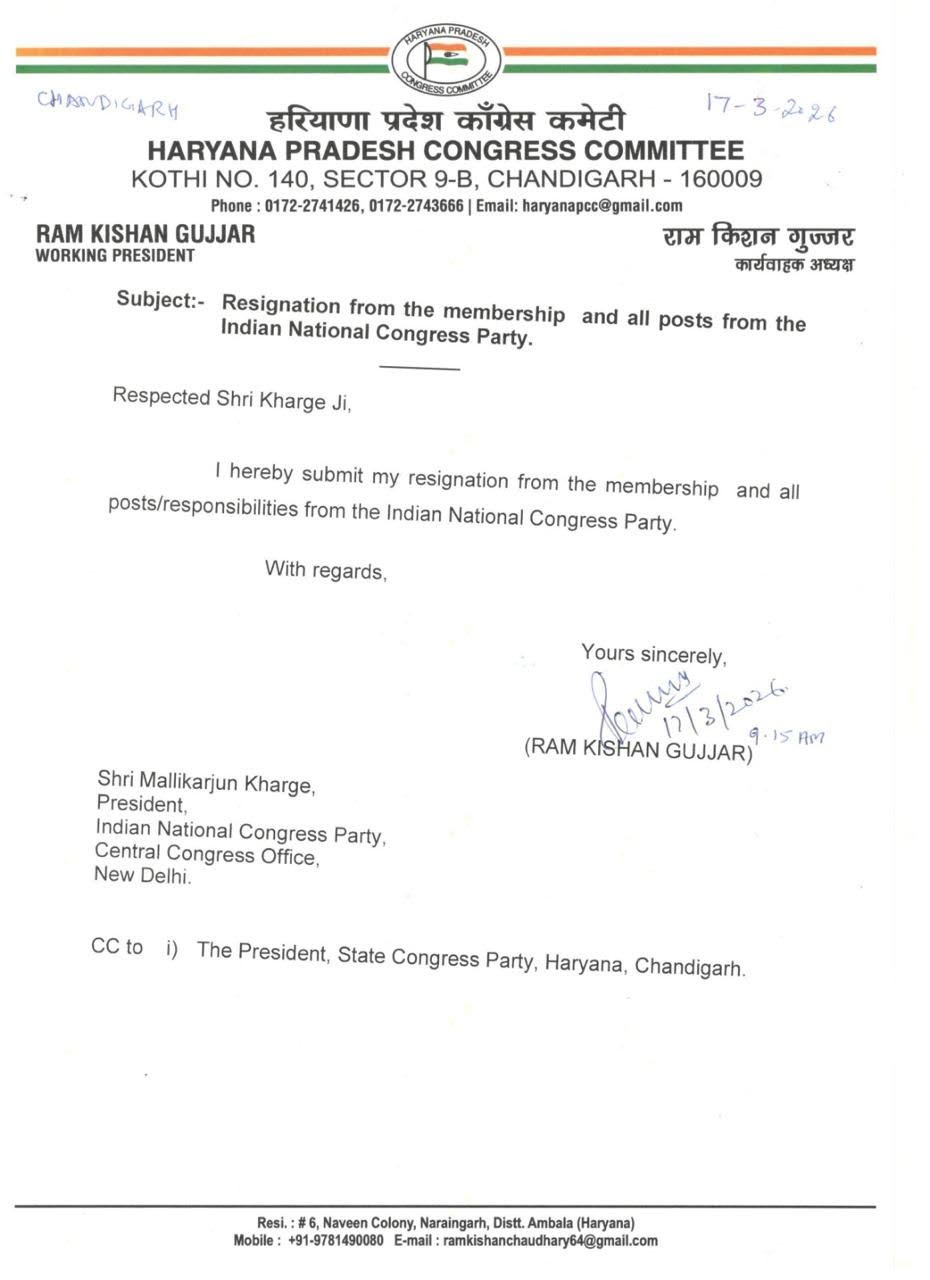 ਰਾਮ ਕਿਸ਼ਨ ਗੁੱਜਰ ਨੇ ਆਪਣਾ ਅਸਤੀਫ਼ਾ ਪੱਤਰ ਕਾਂਗਰਸ ਦੇ ਰਾਸ਼ਟਰੀ ਪ੍ਰਧਾਨ ਮਲਿਕਾਰੁਜਨ ਖੜਗੇ ਨੂੰ ਭੇਜ ਦਿੱਤਾ ਹੈ।