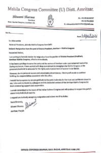 ਅੰਮ੍ਰਿਤਸਰ ਮਹਿਲਾ ਕਾਂਗਰਸ (ਸ਼ਹਿਰੀ) ਦੀ ਜ਼ਿਲ੍ਹਾ ਪ੍ਰਧਾਨ ਸ਼ਿਵਾਨੀ ਸ਼ਰਮਾ ਨੇ ਆਪਣੇ ਅਹੁਦੇ ਤੋਂ ਤੁਰੰਤ ਪ੍ਰਭਾਵ ਨਾਲ ਅਸਤੀਫ਼ਾ ਦੇ ਦਿੱਤਾ ਹੈ।