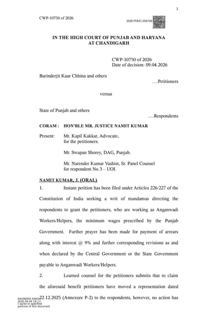 ਸਰਵ ਆਂਗਣਵਾੜੀ ਵਰਕਰ ਹੈਲਪਰ ਯੂਨੀਅਨ ਦੀ ਸੂਬਾ ਪ੍ਰਧਾਨ ਮੈਡਮ ਬਰਿੰਦਰਜੀਤ ਕੌਰ ਛੀਨਾ ਨੇ ਮੀਡੀਆ ਨਾਲ ਗੱਲਬਾਤ ਕਰਦਿਆਂ ਦੱਸਿਆ ਕਿ ਗੁਜਰਾਤ ਹਾਈਕੋਰਟ ਦੀ ਤਰਜ਼ ‘ਤੇ 9 ਅਪ੍ਰੈਲ 2025 ਨੂੰ ਹਾਈਕੋਰਟ ਵਿੱਚ ਪਟੀਸ਼ਨ ਦਾਇਰ ਕੀਤੀ ਗਈ ਸੀ। ਅਦਾਲਤ ਨੇ ਹੁਣ ਪੰਜਾਬ ਸਰਕਾਰ ਤੋਂ 3 ਮਹੀਨਿਆਂ ਦੇ ਅੰਦਰ ਜਵਾਬ ਮੰਗਿਆ ਹੈ ਕਿ ਆਂਗਣਵਾੜੀ ਵਰਕਰਾਂ ਅਤੇ ਹੈਲਪਰਾਂ ਨੂੰ ਘੱਟੋ-ਘੱਟ ਉਜਰਤ ਦੇ ਦਾਇਰੇ ਵਿੱਚ ਲਿਆ ਕੇ, ਤੈਅ ਕੀਤੀ ਗਈ ਰਾਸ਼ੀ 37,247 ਰੁਪਏ ਕਦੋਂ ਤੱਕ ਦਿੱਤੀ ਜਾਵੇਗੀ।