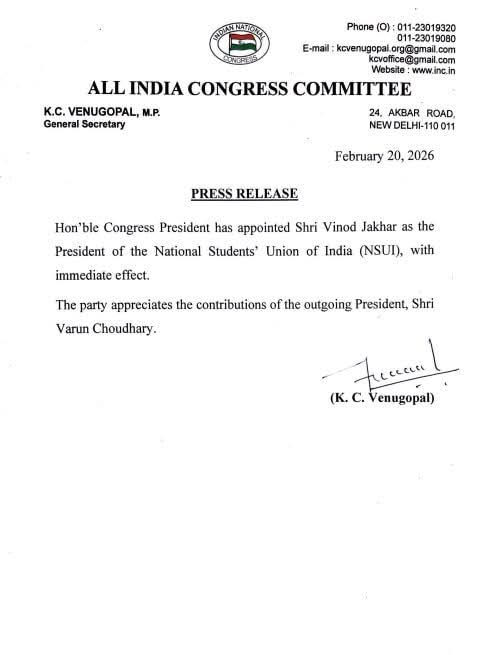 ਨਵੀਂ ਦਿੱਲੀ 20 ਫਰਵਰੀ 2026: ਕਾਂਗਰਸ ਪ੍ਰਧਾਨ ਮਲਿਕਾਰਜੁਨ ਖੜਗੇ ਨੇ ਇਸ ਨਿਯੁਕਤੀ ਨੂੰ ਤੁਰੰਤ ਪ੍ਰਭਾਵ ਨਾਲ ਆਲ ਇੰਡੀਆ ਕਾਂਗਰਸ ਕਮੇਟੀ ਨੇ ਵਿਦਿਆਰਥੀ ਰਾਜਨੀਤੀ ਵਿੱਚ ਇੱਕ ਅਹਿਮ ਫੇਰਬਦਲ ਕਰਦਿਆਂ ਵਿਨੋਦ ਜਾਖੜ ਨੂੰ ਨੈਸ਼ਨਲ ਸਟੂਡੈਂਟਸ ਯੂਨੀਅਨ ਆਫ ਇੰਡੀਆ (NSUI) ਦਾ ਨਵਾਂ ਪ੍ਰਧਾਨ ਨਿਯੁਕਤ ਕੀਤਾ ਹੈ।