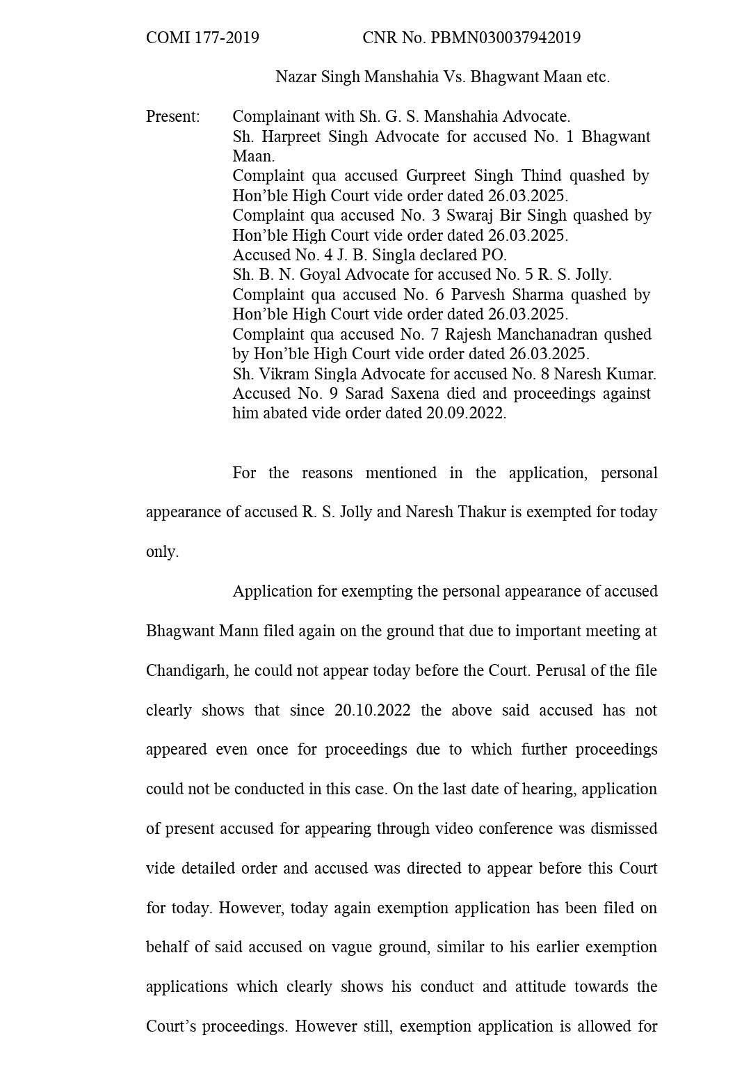 ਅਦਾਲਤ ਨੇ ਮਾਨ ਦੀ ਲਗਾਤਾਰ ਗੈਰ-ਹਾਜ਼ਰੀ ‘ਤੇ ਨਾਰਾਜ਼ਗੀ ਜ਼ਾਹਿਰ ਕਰਦਿਆਂ ਕਿਹਾ ਕਿ ਕਾਨੂੰਨੀ ਪ੍ਰਕਿਰਿਆ ਦਾ ਪਾਲਣ ਕਰਨਾ ਹਰ ਨਾਗਰਿਕ ਲਈ ਲਾਜ਼ਮੀ ਹੈ।