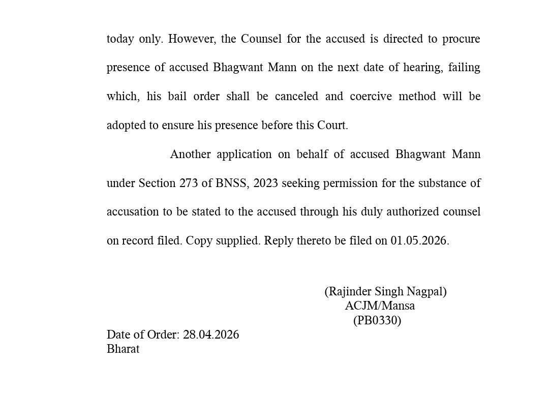 ਮਾਨਸਾ 29 ਅਪ੍ਰੈਲ 2026: ਮਾਨਸਾ ਦੀ ਅਦਾਲਤ ਨੇ ਪੰਜਾਬ ਦੇ ਮੁੱਖ ਮੰਤਰੀ ਭਗਵੰਤ ਸਿੰਘ ਮਾਨ ਦੀ ਅਦਾਲਤੀ ਕਾਰਵਾਈ ਦੌਰਾਨ ਲਗਾਤਾਰ ਹੋ ਰਹੀ ਗੈਰ-ਹਾਜ਼ਰੀ ਦਾ ਗੰਭੀਰ ਨੋਟਿਸ ਲੈਂਦਿਆਂ ਸਖ਼ਤ ਰੁਖ਼ ਅਖਤਿਆਰ ਕੀਤਾ ਹੈ। ਅਦਾਲਤ ਨੇ ਸਪੱਸ਼ਟ ਕੀਤਾ ਹੈ ਕਿ ਹੁਣ ਇਸ ਮਾਮਲੇ ਵਿੱਚ ਹੋਰ ਦੇਰੀ ਬਰਦਾਸ਼ਤ ਨਹੀਂ ਕੀਤੀ ਜਾਵੇਗੀ।