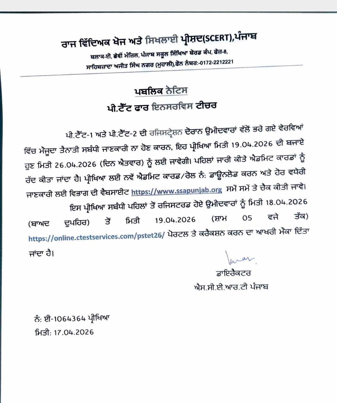 ਪੰਜਾਬ ਦੇ ਇਨ-ਸਰਵਿਸ ਅਧਿਆਪਕਾਂ ਲਈ ਵੱਡੀ ਖਬਰ ਸਾਹਮਣੇ ਆਈ ਹੈ ਕਿ, 19 ਅਪ੍ਰੈਲ ਨੂੰ ਹੋਣ ਵਾਲਾ ਪੀਐਸ-ਟੈਟ ਹੁਣ 26 ਅਪ੍ਰੈਲ ਨੂੰ ਹੋਵੇਗਾ। ਇਸ ਸਬੰਧੀ ਸਿੱਖਿਆ ਵਿਭਾਗ ਦੇ ਵੱਲੋਂ ਇੱਕ ਪਬਲਿਕ ਨੋਟਿਸ ਵੀ ਜਾਰੀ ਕੀਤਾ ਗਿਆ ਹੈ।