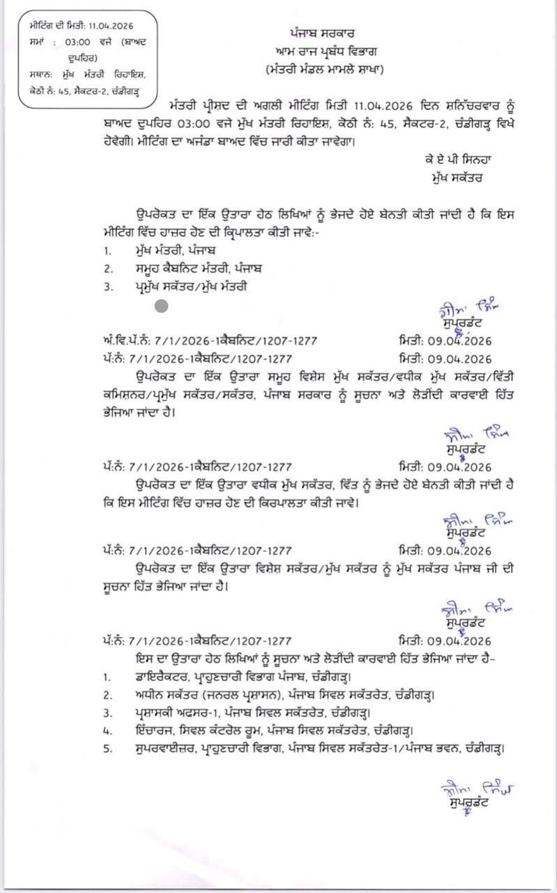 ਚੰਡੀਗੜ੍ਹ, 9 ਅਪ੍ਰੈਲ 2026: ਪੰਜਾਬ ਦੇ ਮੁੱਖ ਮੰਤਰੀ ਭਗਵੰਤ ਸਿੰਘ ਮਾਨ ਨੇ ਆਉਣ ਵਾਲੇ ਵਿਸ਼ੇਸ਼ ਵਿਧਾਨ ਸਭਾ ਸੈਸ਼ਨ ਦੀ ਰਣਨੀਤੀ ਤਿਆਰ ਕਰਨ ਲਈ 11 ਅਪ੍ਰੈਲ ਨੂੰ ਦੁਪਹਿਰ 3:00 ਵਜੇ (ਮੁੱਖ ਮੰਤਰੀ ਰਿਹਾਇਸ਼ (CM House), ਚੰਡੀਗੜ੍ਹ) ਪੰਜਾਬ ਕੈਬਨਿਟ ਦੀ ਇੱਕ ਅਹਿਮ ਮੀਟਿੰਗ ਸੱਦੀ ਹੈ।