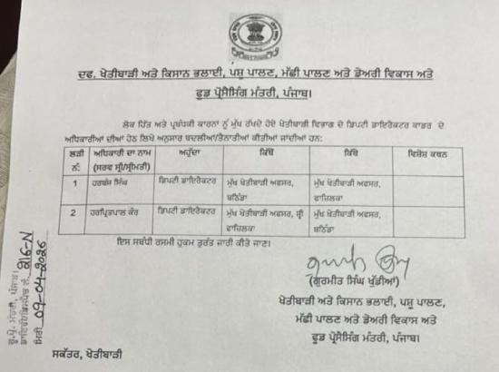 ਚੰਡੀਗੜ੍ਹ, 9 ਅਪ੍ਰੈਲ 2026- ਤਲਵੰਡੀ ਸਾਬੋ ਤੋਂ ਵਿਧਾਇਕਾ ਅਤੇ ਵਿਧਾਨ ਸਭਾ ਵਿੱਚ ਆਮ ਆਦਮੀ ਪਾਰਟੀ ਦੀ ਚੀਫ਼ ਵ੍ਹਿਪ ਬਲਜਿੰਦਰ ਕੌਰ ਵੱਲੋਂ ਬਠਿੰਡਾ ਦੇ ਜਿਸ ਮੁੱਖ ਖੇਤੀਬਾੜੀ ਅਧਿਕਾਰੀ (CAO) ਵਿਰੁੱਧ ਸਖ਼ਤ ਰੁਖ਼ ਅਖਤਿਆਰ ਕੀਤਾ ਗਿਆ ਸੀ, ਉਸ ਦਾ ਸਰਕਾਰ ਵੱਲੋਂ ਤਬਾਦਲਾ ਕਰ ਦਿੱਤਾ ਗਿਆ ਹੈ।
