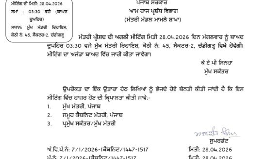 ਚੰਡੀਗੜ੍ਹ 28 ਅਪ੍ਰੈਲ 2026: ਪੰਜਾਬ ਸਰਕਾਰ ਨੇ ਅੱਜ ਮੰਤਰੀ ਪਰਿਸ਼ਦ (ਕੈਬਨਿਟ) ਦੀ ਇੱਕ ਅਹਿਮ ਮੀਟਿੰਗ ਬੁਲਾਈ ਕੀਤੀ ਹੈ। ਇਹ ਮੀਟਿੰਗ ਚੰਡੀਗੜ੍ਹ ਵਿਖੇ ਮੁੱਖ ਮੰਤਰੀ ਦੀ ਰਿਹਾਇਸ਼ ‘ਤੇ ਅੱਜ ਦੁਪਹਿਰ ਦੁਪਹਿਰ 03:30 ਵਜੇ 28 ਅਪ੍ਰੈਲ 2026 (ਦਿਨ ਮੰਗਲਵਾਰ) ਹੋਵੇਗੀ।