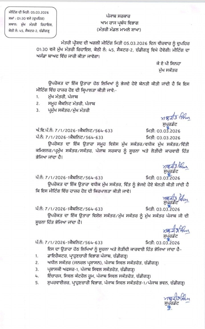 ਚੰਡੀਗੜ੍ਹ, 3 ਮਾਰਚ 2026- ਪੰਜਾਬ ਕੈਬਨਿਟ ਦੀ ਅਹਿਮ ਮੀਟਿੰਗ 5 ਮਾਰਚ ਨੂੰ ਹੋਣ ਜਾ ਰਹੀ ਹੈ। ਜਾਣਕਾਰੀ ਅਨੁਸਾਰ, ਇਹ ਮੀਟਿੰਗ ਸੀਐੱਮ ਭਗਵੰਤ ਮਾਨ ਦੀ ਅਗਵਾਈ ਵਿੱਚ 5 ਮਾਰਚ ਦੁਪਹਿਰ ਡੇਢ ਵਜੇ ਸੀਐੱਮ ਹਾਊਸ ਵਿਖੇ ਹੋਵੇਗੀ।