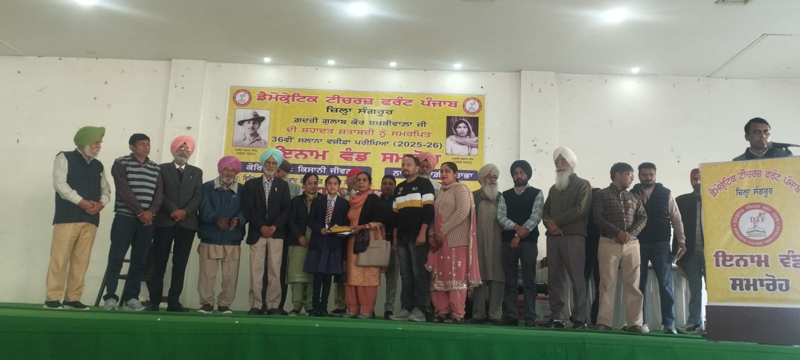ਧੂਰੀ, 14 ਫਰਵਰੀ 2026- ਡੈਮੋਕ੍ਰੈਟਿਕ ਟੀਚਰਜ਼ ਫਰੰਟ ਪੰਜਾਬ ਜ਼ਿਲ੍ਹਾ ਸੰਗਰੂਰ ਵੱਲੋਂ ਲੰਘੇ ਦਸੰਬਰ ਮਹੀਨੇ ਵਿੱਚ ਮਹਾਨ ਸੁਤੰਤਰਤਾ ਸੰਗਰਾਮਣ ਗ਼ਦਰੀ ਗੁਲਾਬ ਕੌਰ ਦੀ ਸ਼ਹਾਦਤ ਸ਼ਤਾਬਦੀ ਨੂੰ ਸਮਰਪਿਤ ਕਰਵਾਈ ਗਈ 36ਵੀਂ ਵਜ਼ੀਫ਼ਾ ਪ੍ਰੀਖਿਆ ਦਾ ਸਨਮਾਨ ਸਮਾਰੋਹ ਅੱਜ ਸਥਾਨਕ ਮਹੇਸ਼ ਬਿਰਧ ਆਸ਼ਰਮ ਦੇ ਹਾਲ ਵਿੱਚ ਕਰਵਾਇਆ ਗਿਆ।