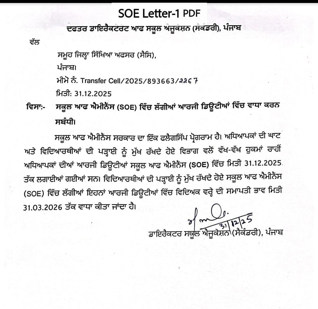 ਅਧਿਆਪਕਾਂ ਦੀ ਘਾਟ ਅਤੇ ਵਿਦਿਆਰਥੀਆਂ ਦੀ ਪੜ੍ਹਾਈ ਨੂੰ ਮੁੱਖ ਰੱਖਦੇ ਹੋਏ ਵਿਭਾਗ ਵੱਲੋਂ ਵੱਖ-ਵੱਖ ਹੁਕਮਾਂ ਰਾਹੀਂ ਅਧਿਆਪਕਾਂ ਦੀਆਂ ਆਰਜ਼ੀ ਡਿਊਟੀਆਂ ਸਕੂਲ ਆਫ਼ ਐਮੀਨੈਂਸ ਵਿੱਚ 31 ਦਸੰਬਰ 2025 ਤੱਕ ਲਗਾਈਆਂ ਗਈਆਂ ਸਨ। ਵਿਦਿਆਰਥੀਆਂ ਦੀ ਪੜ੍ਹਾਈ ਨੂੰ ਮੁੱਖ ਰੱਖਦੇ ਹੋਏ ਸਕੂਲ ਆਫ਼ ਐਮੀਨੈਂਸ ਵਿੱਚ ਲੱਗੀਆਂ ਇਹਨਾਂ ਡਿਊਟੀਆਂ ਵਿੱਚ ਵਿੱਦਿਅਕ ਵਰ੍ਹੇ ਦੀ ਸਮਾਪਤੀ ਭਾਵ 31 ਮਾਰਚ 2026 ਤੱਕ ਵਾਧਾ ਕੀਤਾ ਜਾਂਦਾ ਹੈ। ਯਾਨੀ ਕਿ ਸਕੂਲ ਆਫ਼ ਐਮੀਨੈਂਸ ਵਿੱਚ ਆਰਜ਼ੀ ਤੌਰ ‘ਤੇ ਪੜ੍ਹਾ ਰਹੇ ਅਧਿਆਪਕ ਹੁਣ 31 ਮਾਰਚ ਤੱਕ ਇੱਥੇ ਹੀ ਡਿਊਟੀਆਂ ਨਿਭਾਉਂਦੇ ਰਹਿਣਗੇ।