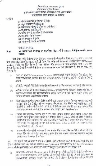 ਚੰਡੀਗੜ੍ਹ, 20 ਅਪ੍ਰੈਲ, 2026- ਪੰਜਾਬ ਸਰਕਾਰ ਦੇ ਵਿੱਤ ਵਿਭਾਗ ਨੇ ਸੂਬੇ ਦੇ ਲੱਖਾਂ ਸਰਕਾਰੀ ਮੁਲਾਜ਼ਮਾਂ ਨੂੰ ਵੱਡੀ ਰਾਹਤ ਦਿੰਦਿਆਂ 6ਵੇਂ ਪੰਜਾਬ ਪੇਅ ਕਮਿਸ਼ਨ ਦੇ ਬਕਾਏ ਦੀ ਅਦਾਇਗੀ ਲਈ iHRMS ਮੋਡੀਊਲ ਨੂੰ ਲਾਈਵ ਕਰ ਦਿੱਤਾ ਹੈ।