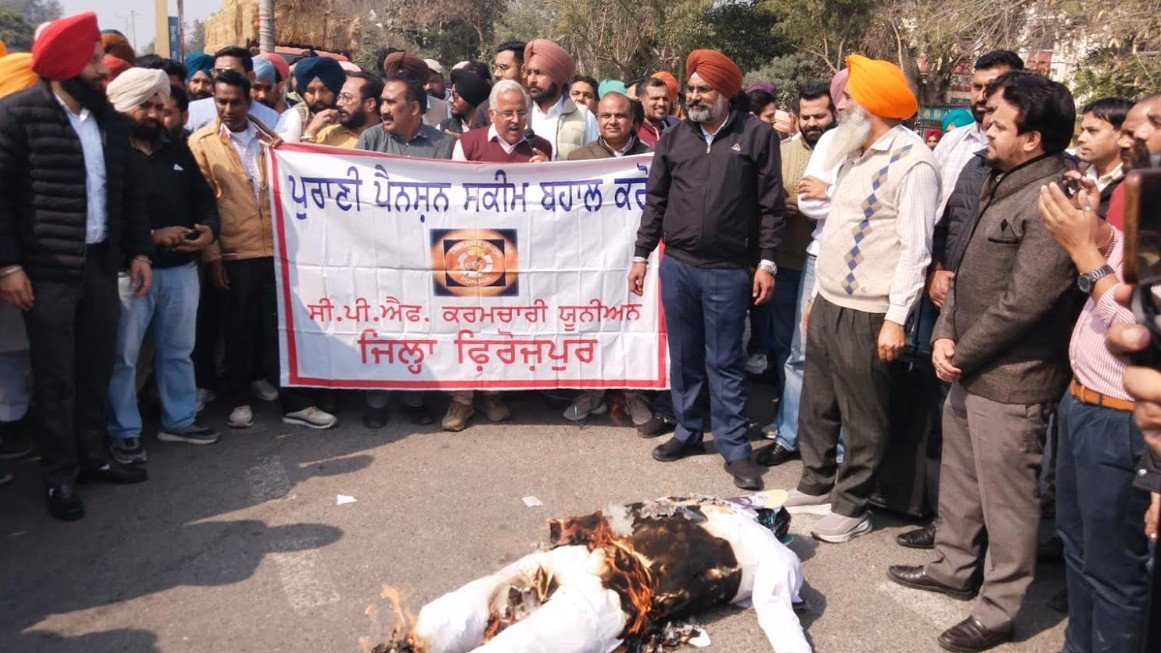 ਸੀ.ਪੀ.ਐਫ. ਕਰਮਚਾਰੀ ਯੂਨੀਅਨ ਪੰਜਾਬ ਅਤੇ ਪੁਰਾਣੀ ਪੈਨਸ਼ਨ ਬਹਾਲੀ ਸੰਘਰਸ਼ ਕਮੇਟੀ ਪੰਜਾਬ ਵੱਲੋ ਐਲਾਨੇ ਸੰਘਰਸ਼ ਤਹਿਤ ਅੱਜ ਇਥੇ ਡੀ.ਸੀ. ਦਫਤਰ ਫਿਰੋਜ਼ਪੁਰ ਦੇ ਮੂਹਰੇ ਸੀ.ਪੀ.ਐਫ. ਕਰਮਚਾਰੀ ਯੂਨੀਅਨ ਜ਼ਿਲ੍ਹਾ ਫਿਰੋਜ਼ਪੁਰ ਵੱਲੋ ਜਥੇਬੰਦੀ ਦੇ ਜ਼ਿਲ੍ਹਾ ਪ੍ਰਧਾਨ ਜਗਸੀਰ ਸਿੰਘ ਭਾਂਗਰ ਅਤੇ ਜਨਰਲ ਸਕੱਤਰ ਸੋਨੂੰ ਕਸ਼ਅਪ ਦੀ ਅਗਵਾਈ ਹੇਠ ਪੁਰਾਣੀ ਪੈਨਸ਼ਨ ਸਕੀਮ ਬਹਾਲੀ ਦੀ ਮੰਗ ਨੂੰ ਲੈ ਕੇ ਜ਼ਬਰਦਸਤ ਨਾਹਰੇਬਾਜ਼ੀ ਕਰਦੇ ਹੋਏ ਵਿਸ਼ਾਲ ਜ਼ਿਲ੍ਹਾ ਪੱਧਰੀ ਅਰਥੀ ਫੂਕ ਮੁਜ਼ਾਹਰਾ ਕੀਤਾ ਗਿਆ। ਜਿਸ ਵਿਚ ਵੱਖ ਵੱਖ ਵਿਭਾਗਾਂ ਦੇ ਮੁਲਾਜ਼ਮਾਂ ਅਤੇ ਭਰਾਤਰੀ ਜਥੇਬੰਦੀਆਂ ਦੇ ਆਗੂਆਂ ਨੇ ਵੱਡੀ ਗਿਣਤੀ ਵਿਚ ਹਿੱਸਾ ਲਿਆ।
