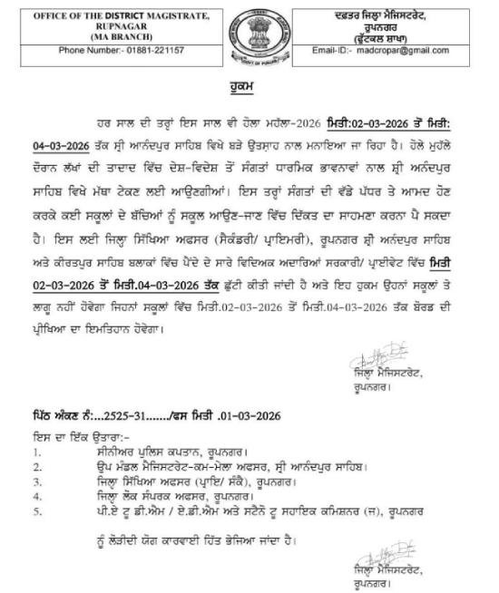 ਜ਼ਿਲ੍ਹਾ ਮੈਜਿਸਟ੍ਰੇਟ ਰੂਪਨਗਰ ਵੱਲੋਂ ਜਾਰੀ ਕੀਤੇ ਗਏ ਤਾਜ਼ਾ ਹੁਕਮਾਂ (ਪੱਤਰ ਨੰ: 2525-31) ਅਨੁਸਾਰ, 2 ਮਾਰਚ ਤੋਂ 4 ਮਾਰਚ 2026 ਤੱਕ ਸ੍ਰੀ ਅਨੰਦਪੁਰ ਸਾਹਿਬ ਅਤੇ ਕੀਰਤਪੁਰ ਸਾਹਿਬ ਬਲਾਕਾਂ ਦੇ ਸਾਰੇ ਸਰਕਾਰੀ ਅਤੇ ਪ੍ਰਾਈਵੇਟ ਸਕੂਲ/ਕਾਲਜ ਬੰਦ ਰਹਿਣਗੇ।