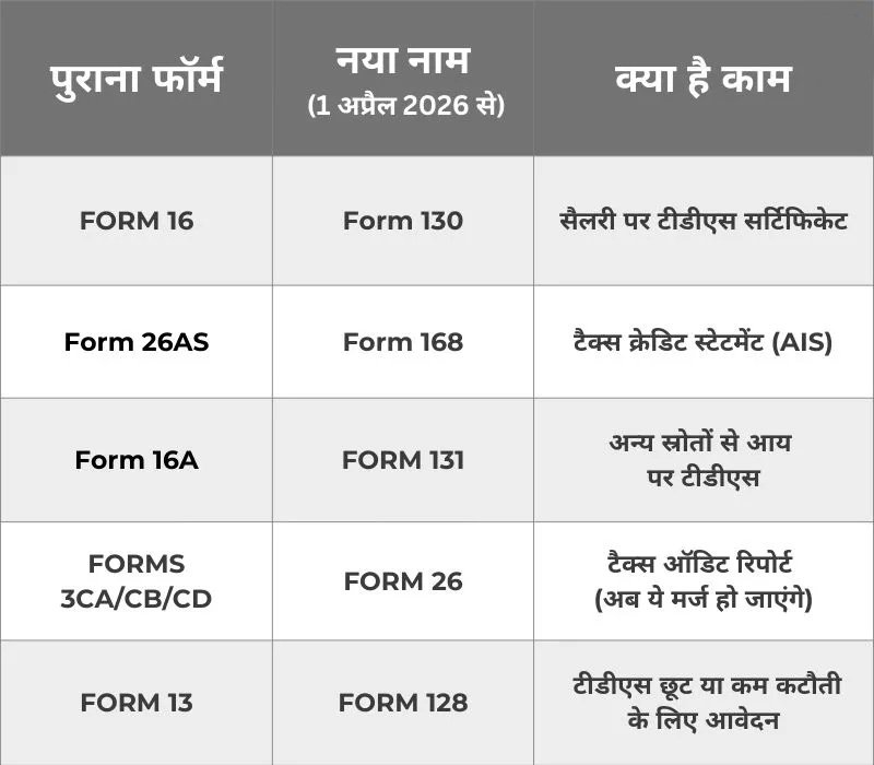 ਭਾਰਤ ਸਰਕਾਰ ਦੇ ਪ੍ਰਸਤਾਵਿਤ ਆਮਦਨ ਕਰ ਨਿਯਮ 2026 ਦੇ ਅਨੁਸਾਰ, 1 ਅਪ੍ਰੈਲ, 2026 ਤੋਂ, ਬਹੁਤ ਸਾਰੇ ਪੁਰਾਣੇ ਟੈਕਸ ਫਾਰਮ ਇਤਿਹਾਸ ਬਣ ਜਾਣਗੇ ਅਤੇ ਨਵੇਂ ਨੰਬਰਾਂ ਵਾਲੇ ਫਾਰਮਾਂ ਦੁਆਰਾ ਬਦਲ ਦਿੱਤੇ ਜਾਣਗੇ।