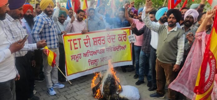 ਅਧਿਆਪਕ ਜਥੇਬੰਦੀਆਂ ਦੇ ਆਗੂਆਂ ਕਰਮਜੀਤ ਤਾਮਕੋਟ, ਨਰਿੰਦਰ ਮਾਖਾ, ਹੰਸਾ ਸਿੰਘ ਡੇਲੂਆਣਾ ਅਤੇ ਦਰਸ਼ਨ ਅਲੀਸ਼ੇਰ ਦੀ ਅਗਵਾਈ ਵਿੱਚ ਮਾਨਸਾ ਦੇ ਹਲਕਾ ਵਿਧਾਇਕ ਵਿਜੇ ਸਿੰਗਲਾ ਦੇ ਘਰ ਅੱਗੇ ਤਨਖਾਹਾਂ ਨਾ ਮਿਲਣ ਅਤੇ ਕੇਂਦਰ ਸਰਕਾਰ ਦੇ ਇਸ਼ਾਰੇ ‘ਤੇ ਸੁਪਰੀਮ ਕੋਰਟ ਰਾਹੀਂ ਟੈੱਟ (ਅਧਿਆਪਕ ਯੋਗਤਾ ਟੈਸਟ) ਦੀ ਬਿਲਕੁਲ ਬੇਲੋੜੀ, ਗੈਰਵਿਧਾਨਿਕ ਸ਼ਰਤ ਜਬਰੀ ਥੋਪਣ, ਪੰਜਾਬ ਸਰਕਾਰ ਵਲੋਂ ਬਜਟ ਸੈਸ਼ਨ ਦੌਰਾਨ ਅਧਿਆਪਕਾਂ ਦੀ ਸੇਵਾ ਸੁਰੱਖਿਆ ਲਈ ਬਿੱਲ ਨਾ ਲਿਆਉਣ, ਸੁਪਰੀਮ ਕੋਰਟ ਵਿੱਚ ਰੀਵਿਊ ਪਟੀਸ਼ਨ ਦਾਖਲ ਨਾ ਕਰਨ, ਸਿੱਖਿਆ ਵਿਭਾਗ ਵਲੋਂ ਕੁਝ ਵਰਗਾਂ ਨੂੰ ਟੈੱਟ ਤੋਂ ਛੋਟ ਦੇਣ ਦਾ ਪੱਤਰ ਰੱਦ ਕਰਨ, ਸੰਘਰਸ਼ ਦੌਰਾਨ ਜਲ ਤੋਪਾਂ, ਲਾਠੀਚਾਰਜ ਅਤੇ ਅਥਰੂ ਗੈਸ ਦੇ ਗੋਲਿਆਂ ਦੀ ਅੰਨ੍ਹੇਵਾਹ ਵਰਤੋਂ ਕਰਕੇ ਅਧਿਆਪਕਾਂ ਨੂੰ ਜਖਮੀ ਕਰਕੇ ਰਾਸ਼ਟਰ ਨਿਰਮਾਤਾ ਅਧਿਆਪਕਾਂ ਦੇ ਮਾਨ ਸਨਮਾਨ ਨੂੰ ਸੱਟ ਮਾਰਨ ਦੇ ਵਿਰੋਧ ਵਿੱਚ ਪੰਜਾਬ ਸਰਕਾਰ ਦੀ ਅਰਥੀ ਫੂਕੀ ਗਈ।