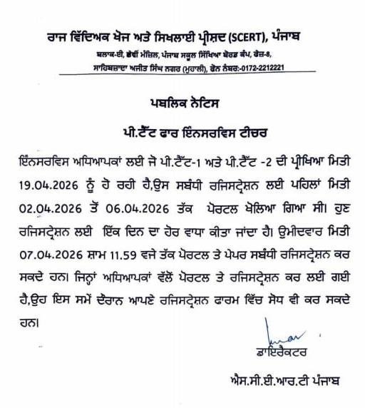 ਮੋਹਾਲੀ, 7 ਅਪ੍ਰੈਲ 2026: ਰਾਜ ਵਿੱਦਿਅਕ ਖੋਜ ਅਤੇ ਸਿਖਲਾਈ ਪ੍ਰੀਸ਼ਦ (SCERT), ਪੰਜਾਬ ਵੱਲੋਂ ਇਨ-ਸਰਵਿਸ ਅਧਿਆਪਕਾਂ ਲਈ ਲਈ ਜਾਣ ਵਾਲੀ ਪੀ.ਟੈੱਟ (PSTET-1 ਅਤੇ PSTET-2) ਪ੍ਰੀਖਿਆ ਸਬੰਧੀ ਇੱਕ ਅਹਿਮ ਜਨਤਕ ਨੋਟਿਸ ਜਾਰੀ ਕੀਤਾ ਗਿਆ ਹੈ।