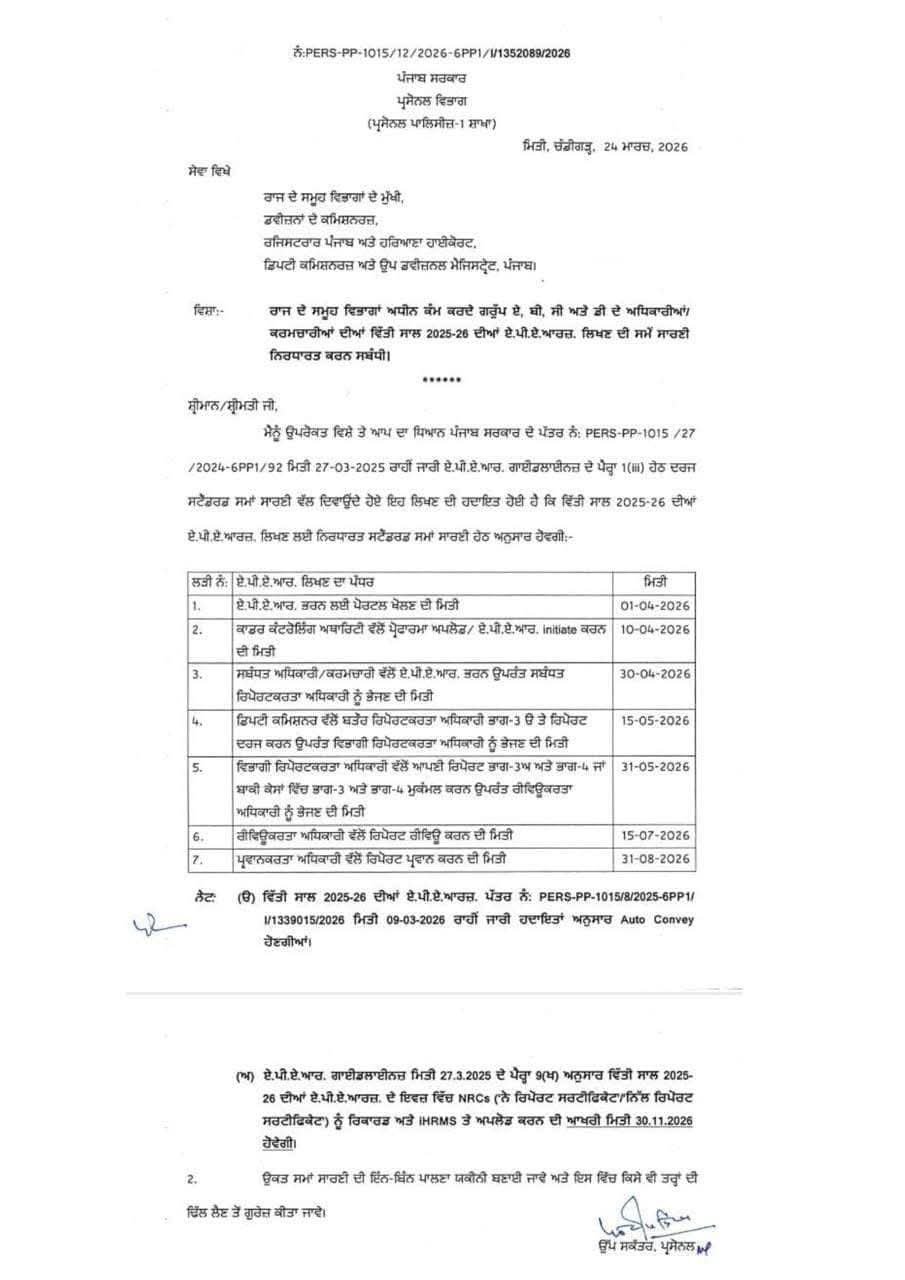 ਪੰਜਾਬ ਸਰਕਾਰ ਦੇ ਪਰਸੋਨਲ ਵਿਭਾਗ (ਪਰਸੋਨਲ ਪਾਲਿਸੀਆਂ-1 ਸ਼ਾਖਾ) ਵੱਲੋਂ ਵਿੱਤੀ ਸਾਲ 2025-26 ਲਈ ਗਰੁੱਪ-ਏ, ਬੀ, ਸੀ ਅਤੇ ਡੀ ਦੇ ਅਧਿਕਾਰੀਆਂ ਤੇ ਕਰਮਚਾਰੀਆਂ ਦੀਆਂ ਸਾਲਾਨਾ ਪ੍ਰਦਰਸ਼ਨ ਰਿਪੋਰਟਾਂ (Annual Performance Appraisal Reports – A.P.A.R.) ਲਿਖਣ ਲਈ ਨਿਰਧਾਰਤ ਸਮਾਂ ਸਾਰਣੀ (ਟਾਈਮ ਸ਼ਡਿਊਲ) ਜਾਰੀ ਕਰ ਦਿੱਤੀ ਗਈ ਹੈ।