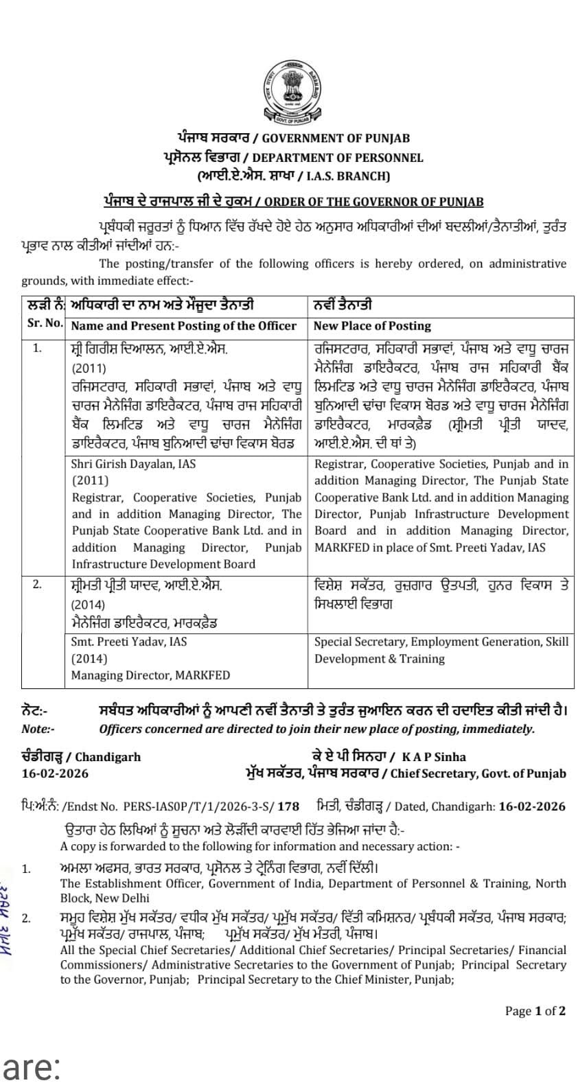 ਚੰਡੀਗੜ੍ਹ, 16 ਫਰਵਰੀ 2026- ਪੰਜਾਬ ਸਰਕਾਰ ਦੇ ਵੱਲੋਂ ਦੋ ਸੀਨੀਅਰ ਆਈਏਐਸ ਅਫ਼ਸਰਾਂ ਦਾ ਤਬਾਦਲਾ ਕੀਤਾ ਹੈ।