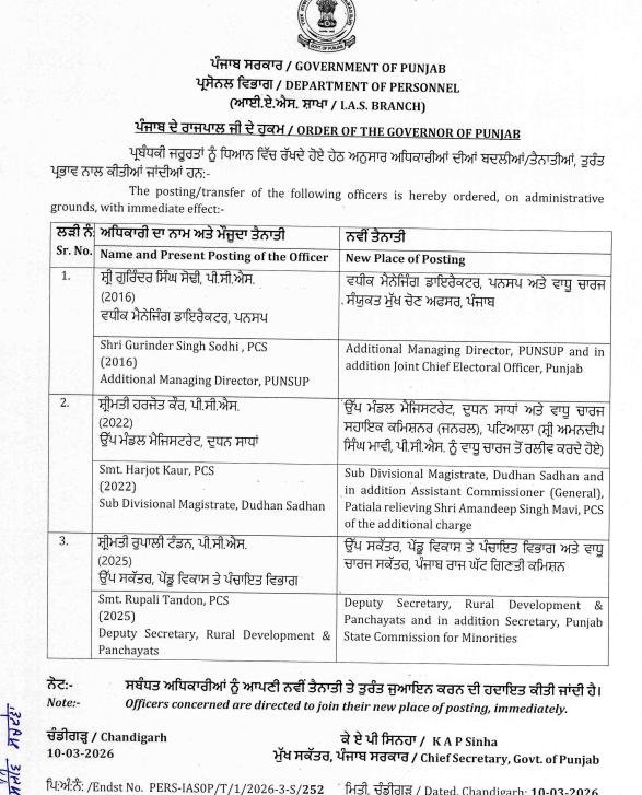 ਚੰਡੀਗੜ੍ਹ, 10 ਮਾਰਚ 2026- ਪੰਜਾਬ ਸਰਕਾਰ ਦੇ ਵੱਲੋਂ ਸੂਬੇ ਦੇ ਤਿੰਨ ਪੀਸੀਐਸ ਅਫ਼ਸਰਾਂ ਦਾ ਤਬਾਦਲਾ ਕੀਤਾ ਗਿਆ ਹੈ।