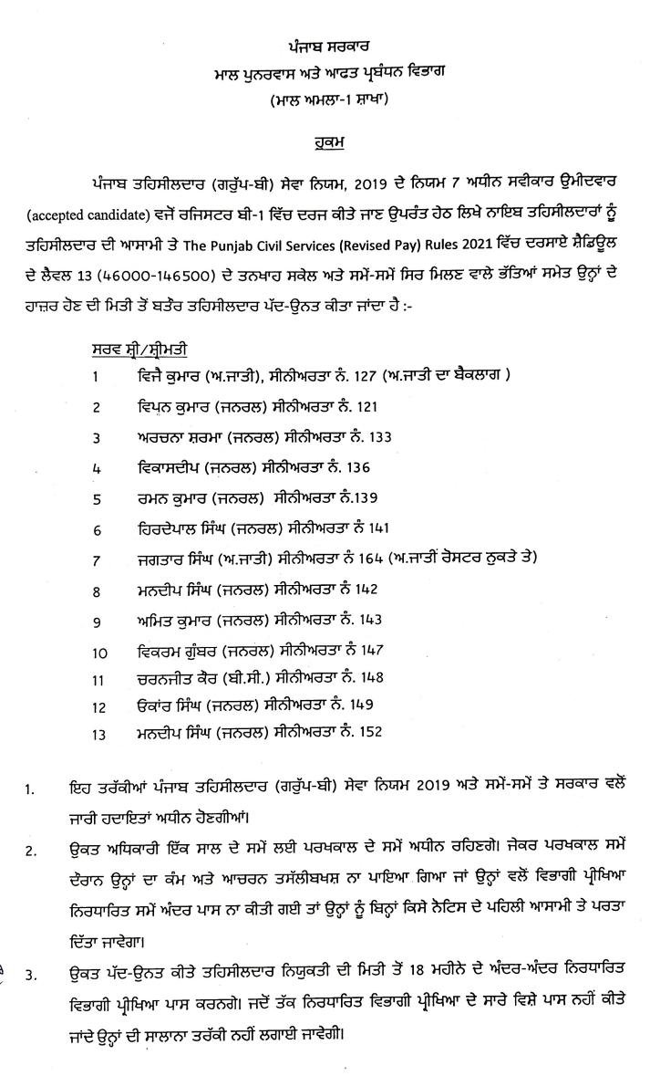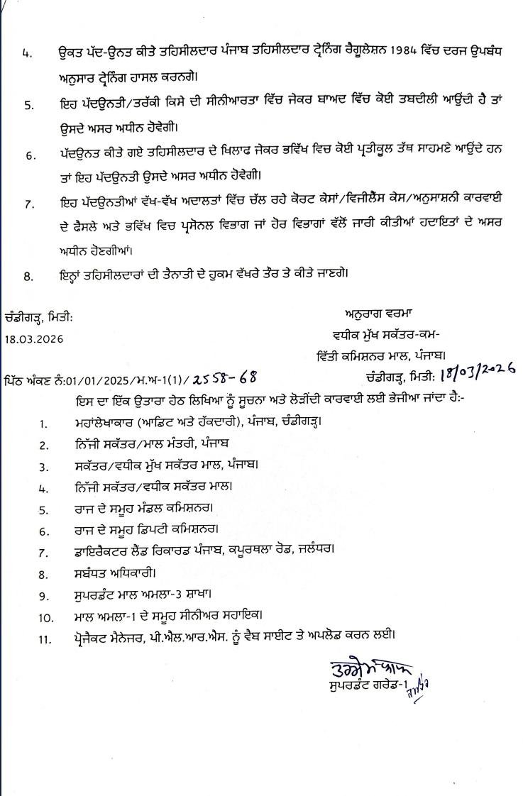 ਤਰੱਕੀ ਹਾਸਲ ਕਰਨ ਵਾਲੇ ਇਨ੍ਹਾਂ ਅਧਿਕਾਰੀਆਂ ਨੂੰ ਜਲਦੀ ਹੀ ਸੂਬੇ ਦੀਆਂ ਵੱਖ-ਵੱਖ ਤਹਿਸੀਲਾਂ ਵਿੱਚ ਤਾਇਨਾਤ ਕੀਤਾ ਜਾਵੇਗਾ।