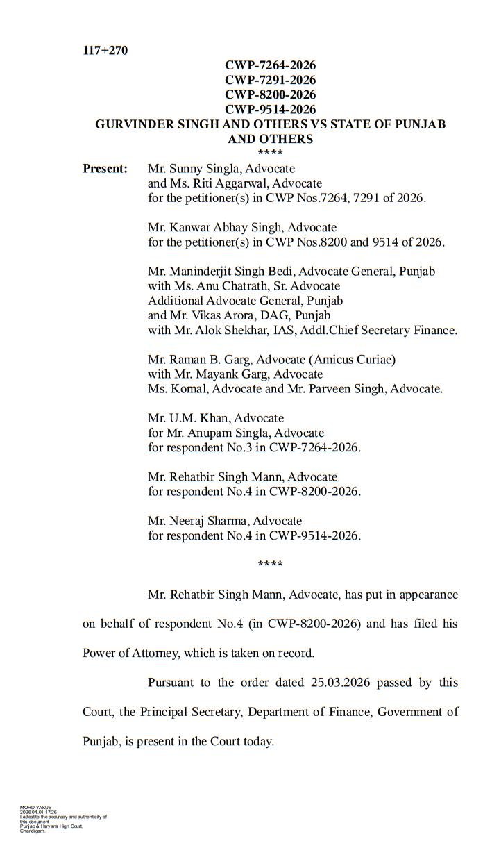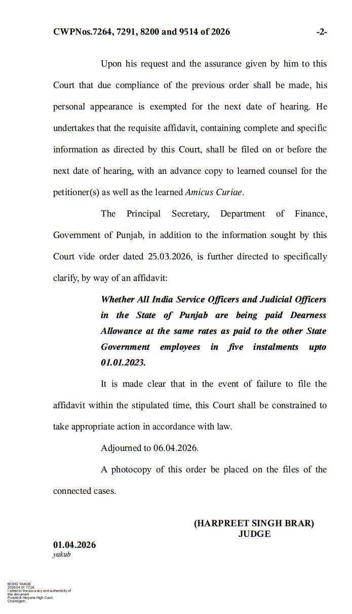 ਮਾਨਯੋਗ ਜੱਜ ਨੇ ਸਰਕਾਰ ਨੂੰ ਹਲਫ਼ਨਾਮੇ ਰਾਹੀਂ ਇਹ ਸਪੱਸ਼ਟ ਕਰਨ ਦੇ ਨਿਰਦੇਸ਼ ਦਿੱਤੇ ਹਨ ਕਿ, ਕੀ ਪੰਜਾਬ ਵਿੱਚ ਆਲ ਇੰਡੀਆ ਸਰਵਿਸਿਜ਼ ਅਤੇ ਜੁਡੀਸ਼ੀਅਲ ਅਫ਼ਸਰਾਂ ਨੂੰ ਉਸੇ ਦਰ ‘ਤੇ DA ਦਿੱਤਾ ਜਾ ਰਿਹਾ ਹੈ, ਜਿਸ ਦਰ ‘ਤੇ ਬਾਕੀ ਰਾਜ ਮੁਲਾਜ਼ਮਾਂ ਨੂੰ 01.01.2023 ਤੱਕ ਦੀਆਂ ਪੰਜ ਕਿਸ਼ਤਾਂ ਦਿੱਤੀਆਂ ਗਈਆਂ ਹਨ?