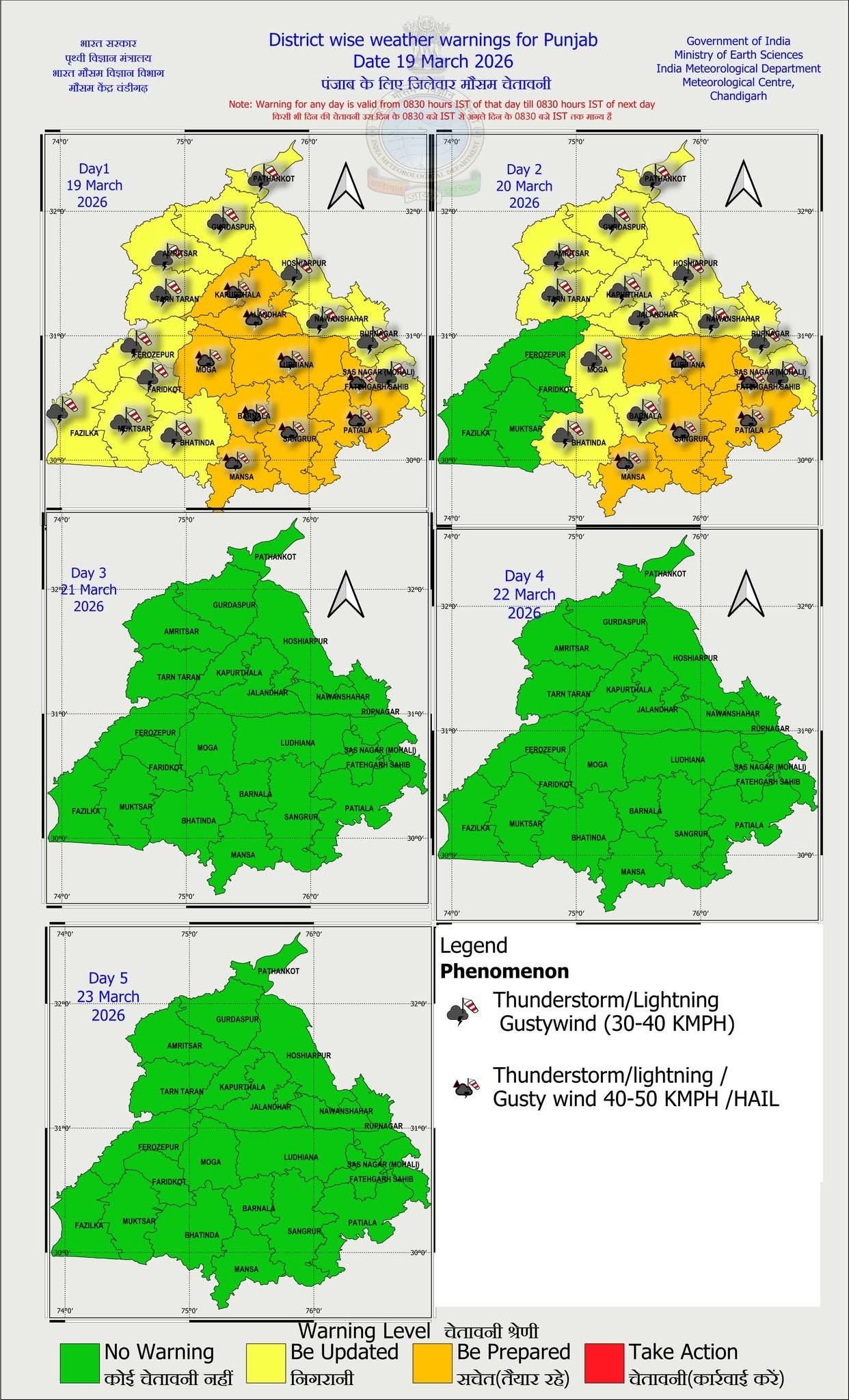 ਮੌਸਮ ਵਿਭਾਗ ਦੇ ਅਨੁਸਾਰ, ਪੰਜਾਬ ਦੇ ਪੰਜ ਜ਼ਿਲ੍ਹਿਆਂ: ਪਠਾਨਕੋਟ, ਗੁਰਦਾਸਪੁਰ, ਹੁਸ਼ਿਆਰਪੁਰ, ਨਵਾਂਸ਼ਹਿਰ ਅਤੇ ਰੂਪਨਗਰ ਵਿੱਚ 30 ਤੋਂ 40 ਕਿਲੋਮੀਟਰ ਪ੍ਰਤੀ ਘੰਟਾ ਦੀ ਰਫ਼ਤਾਰ ਨਾਲ ਤੂਫ਼ਾਨ, ਬਿਜਲੀ ਡਿੱਗਣ ਅਤੇ ਤੇਜ਼ ਹਵਾਵਾਂ ਚੱਲਣ ਦੀ ਭਵਿੱਖਬਾਣੀ ਕੀਤੀ ਗਈ ਹੈ।